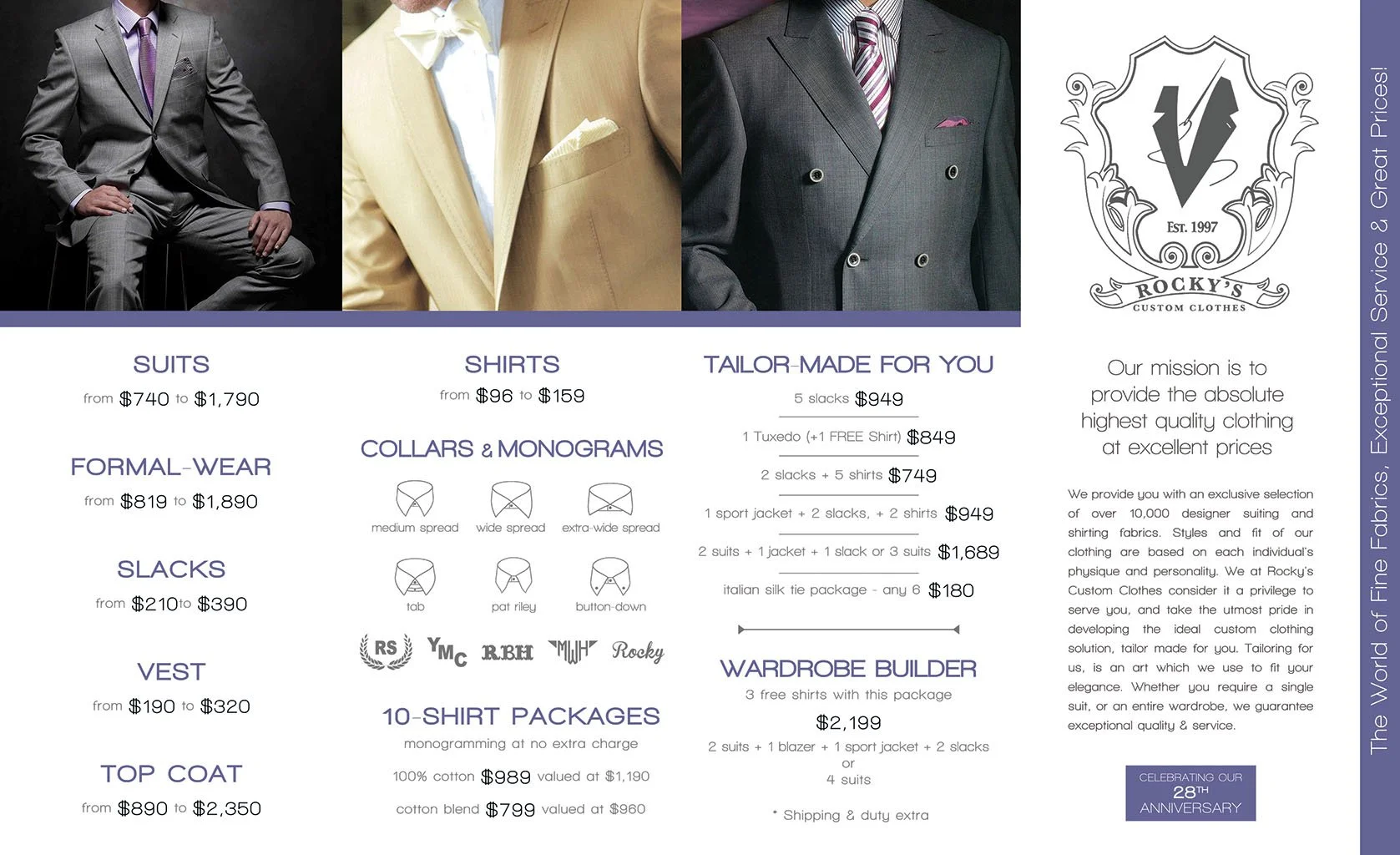 Our customized clothing solutions begin by offering you a range of fine fabrics chosen from Europe to the Americas. We then address the style you want and the personality you wish to express. For us, Tailoring is an art which we use to fit your elegance. Your step of ultimate confidence in Rocky's outfit is our true expression of joy.